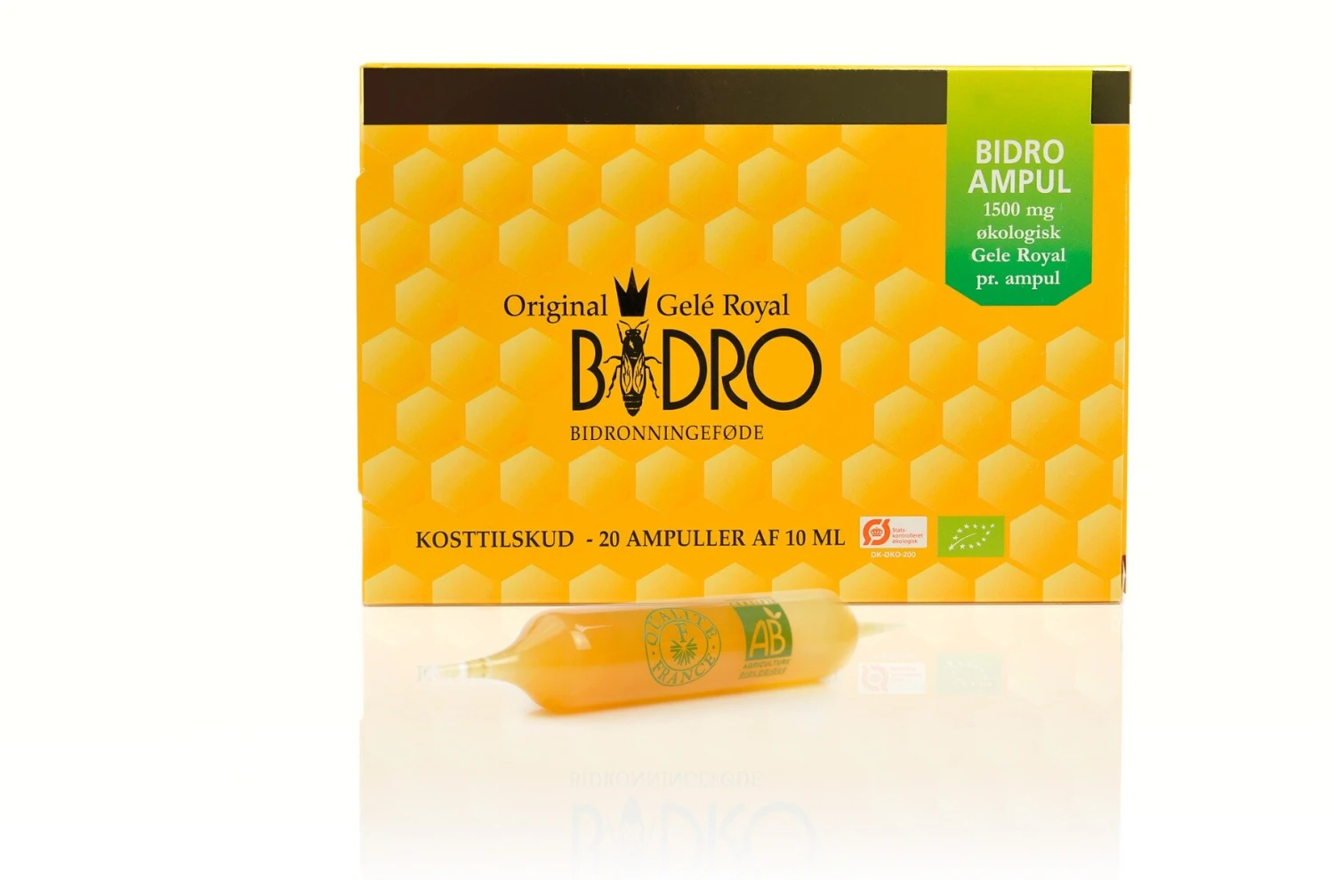 Bidro Gelé Royal Ampull har et høyt innhold av fersk økologisk bidronninggelé. Bidronninggelé er et meget næringsrikt sekret som arbeidsbiene skiller ut til bidronningen, som hun kan spise. Geleen er et rent og svært potent stoff som sørger for at dronningen lever et langt og fruktbart liv. Det inneholder både vitaminer, mineraler og ikke minst proteiner, som kan bidra til å beskytte mot aldringsprosessen. Kan også brukes som energishot. Bidronninggelé skal også være godt for hud, hår og negler, samt bidra til normal hormonell balanse.