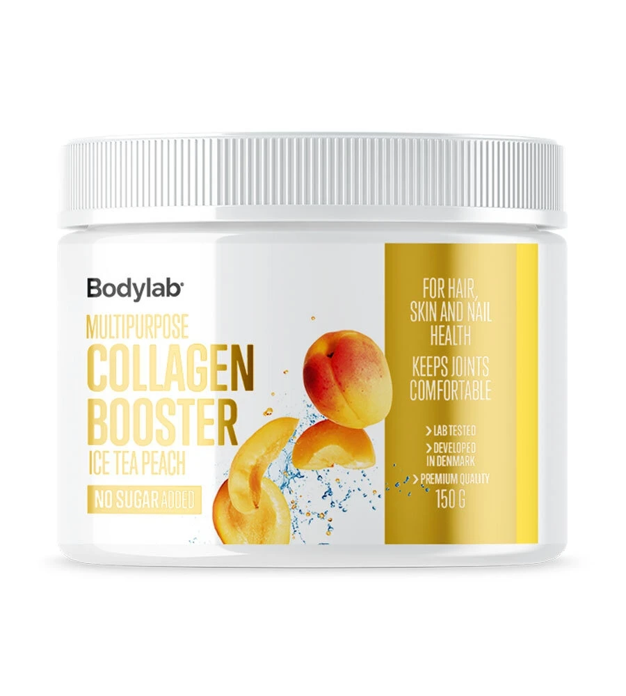 Du blander bare kollagenpulveret med vann og drikker det som et glass juice eller saft. Collagen Boosteren med søt smak av Ice Tea Peach.