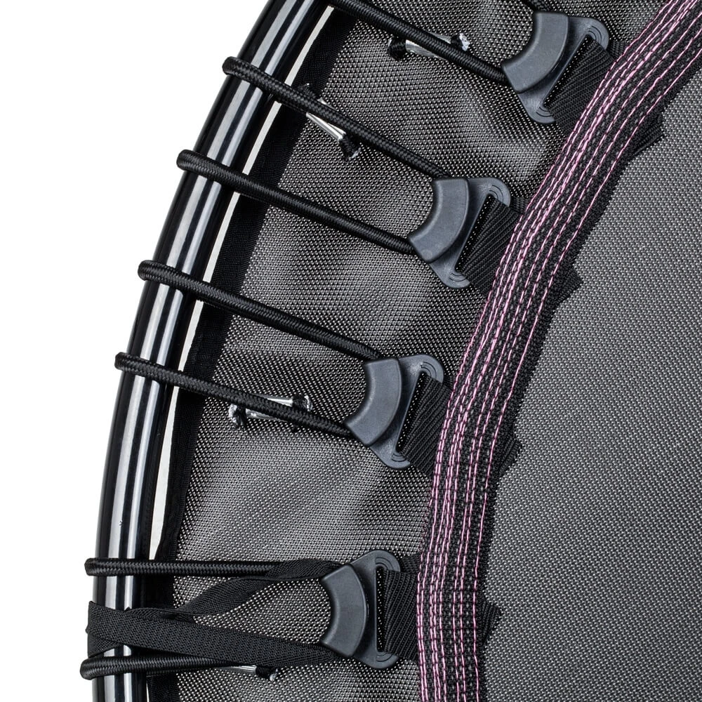 inSPORTline Spring-Free Trampoline Cordy 114 cm festes med 32 st fleksible sløyfer og således har matten ingen harde deler som grenser til hoppeflaten, noe som gir høyere sikkerhet.
