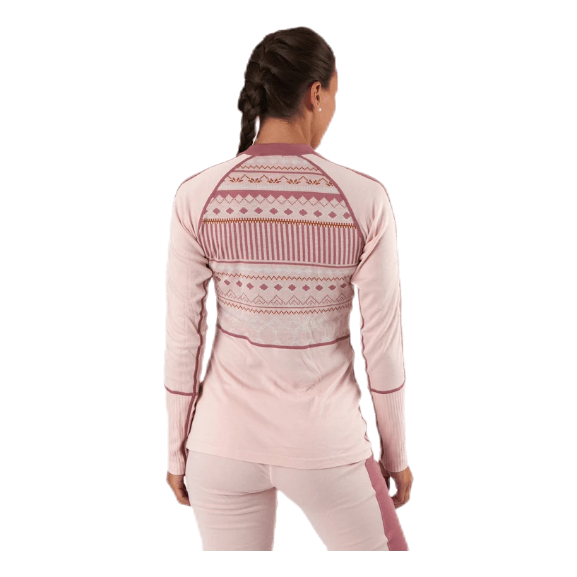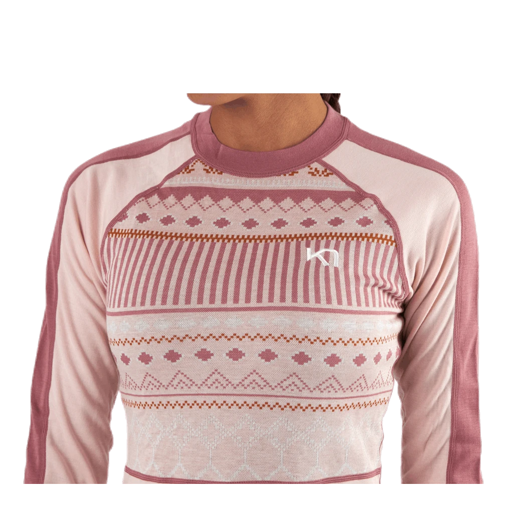 “Kari Traa Perle Long Sleeve er en blandet baselayer-overdel for kvinner med en dristig jacquardstrikket design på brystet. Det hurtigtørkende stoffet transporterer fuktighet bort fra kroppen når intensiteten øker. Det slanke snittet, ribbet underarm og solid -fargede raglanermer legger til utseendet og gjør det flott å ha på seg under andre lag. Denne 4-sesongens favoritten er også flott for kontrast-farge-miks og matching med Perle Pant-stiler.”