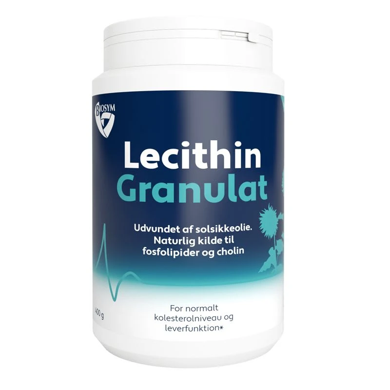 Lecithin Granulat fra solsikke. Lecitin granulatet fra Biosym har et høyt innhold av fosfolipider, bl.a. Kolin, som er gunstig for leveren og kroppens fettomsetning. Kolin bidrar til å opprettholde normal leverfunksjon. Kolin bidrar til normal omsetning av lipider (fett) og homocystein, som er viktig for å opprettholde hjertets helse. Produktet er registrert ved The Vegan Society. Kilden til de gunstige fettstoffene i Lecithin Granulat er fra solsikkeolje (GMO-fri solsikke).