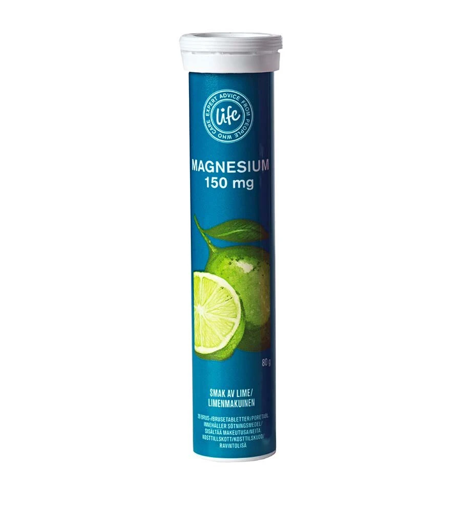Life magnesium brusetabletter inneholder 150 mg magnesium basert på tre ulike sorter magnesium. Tablettene har naturlig aroma fra lime og sitron. Tablettene løser seg lett opp i vann og drikken smaker godt.