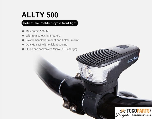 Allty 500 uses universal Garmin style base, and is compatible with our TTA out front aluminum mount. The package includes the rubber handlebar mount strap and an adjustable angle helmet mount. If you are looking for a budget friendly, light weight, highly portable and convenient all in one bicycle headlight, you should definitely give Allty 500 a go.
