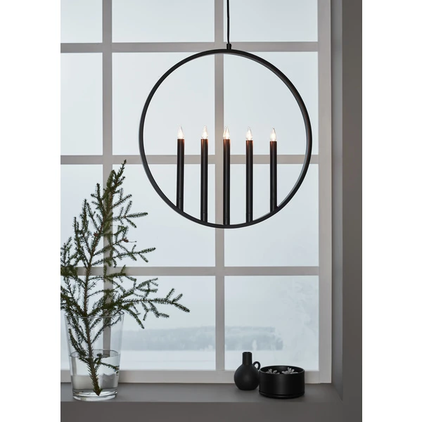Hengende lysestake med ring i svart metall og fem lys. 3,5m svart kabel. Max 5x3W. E10-sockel.