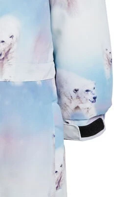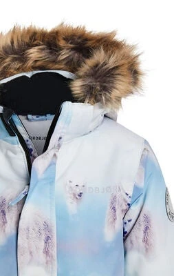 Vind- og vanntett, mønstret Froste vinterdress fra Nordbjørn med teipede sømmer, slik at vann ikke trenger inn. Den har et varmt, koselig fôr i polyesterfleece og en avtagbar hette med fuskepels til de kalde vintermånedene. Vinterdressen har to sidelommer med glidelåser og refleksdetaljer. – Pusteevne: 3000g/m²/24h. – Vannsøyle: 5000 mm. – Ytterstoff: 100 % polyester. – Fôr: 100 % polyesterfleece.