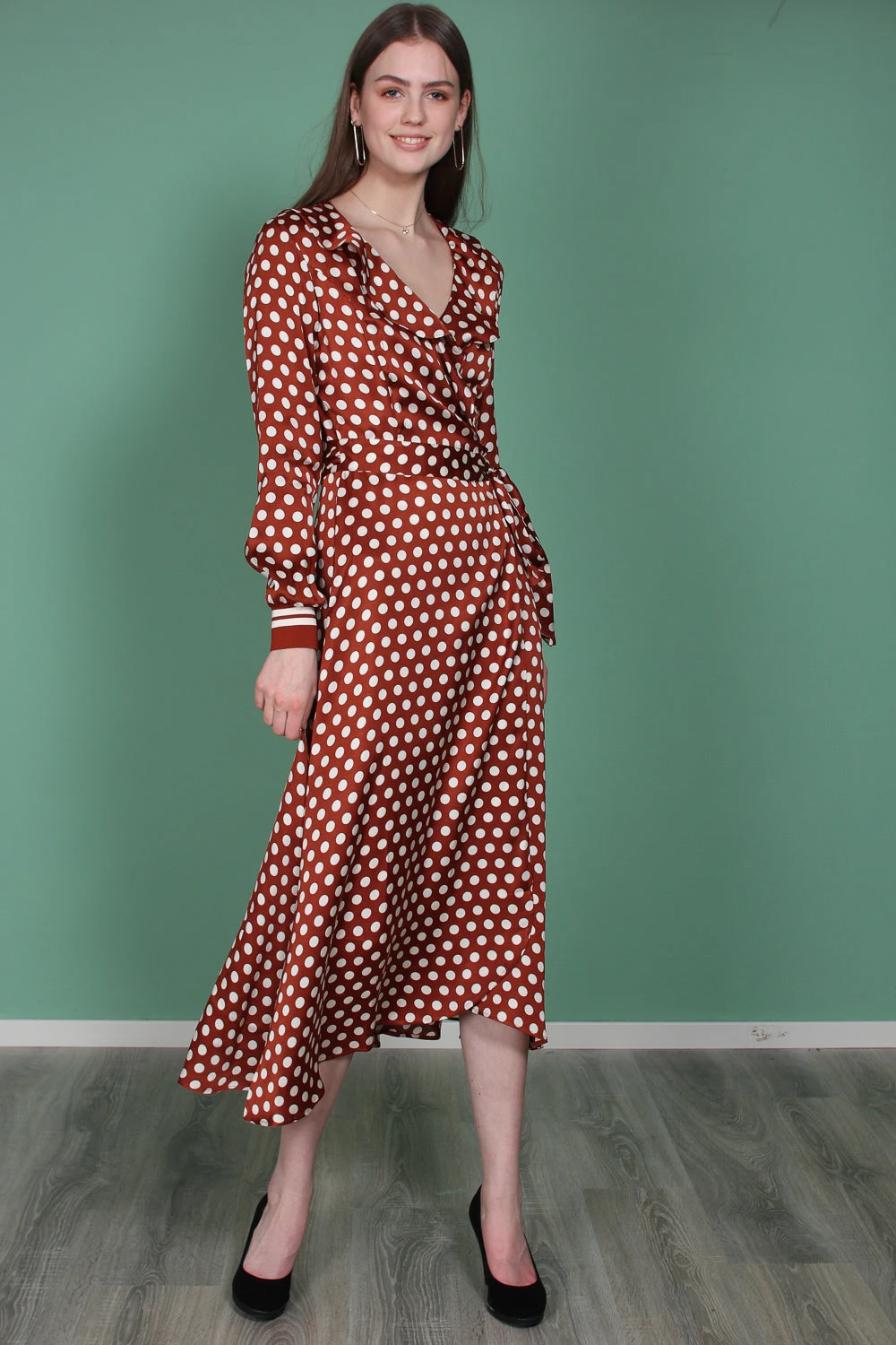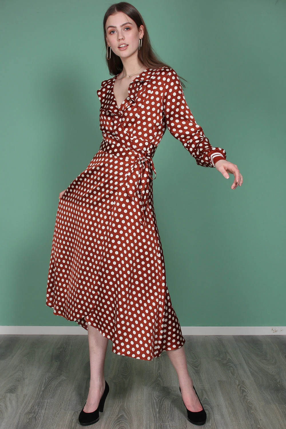Søt wrapkjole med prikker fra Second Female.Volanger i krage og utringning, med kort splitt i skjørtet.