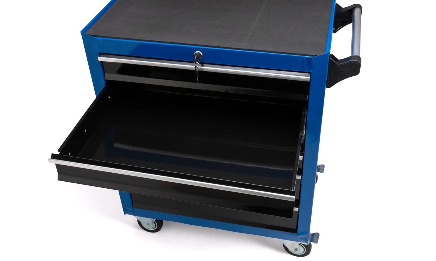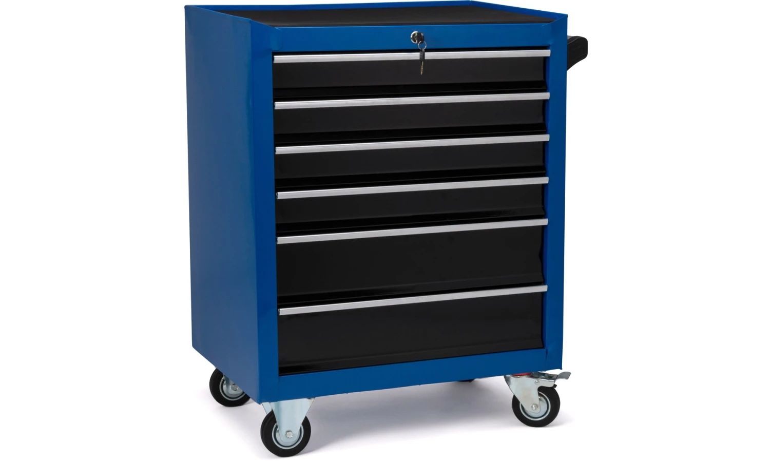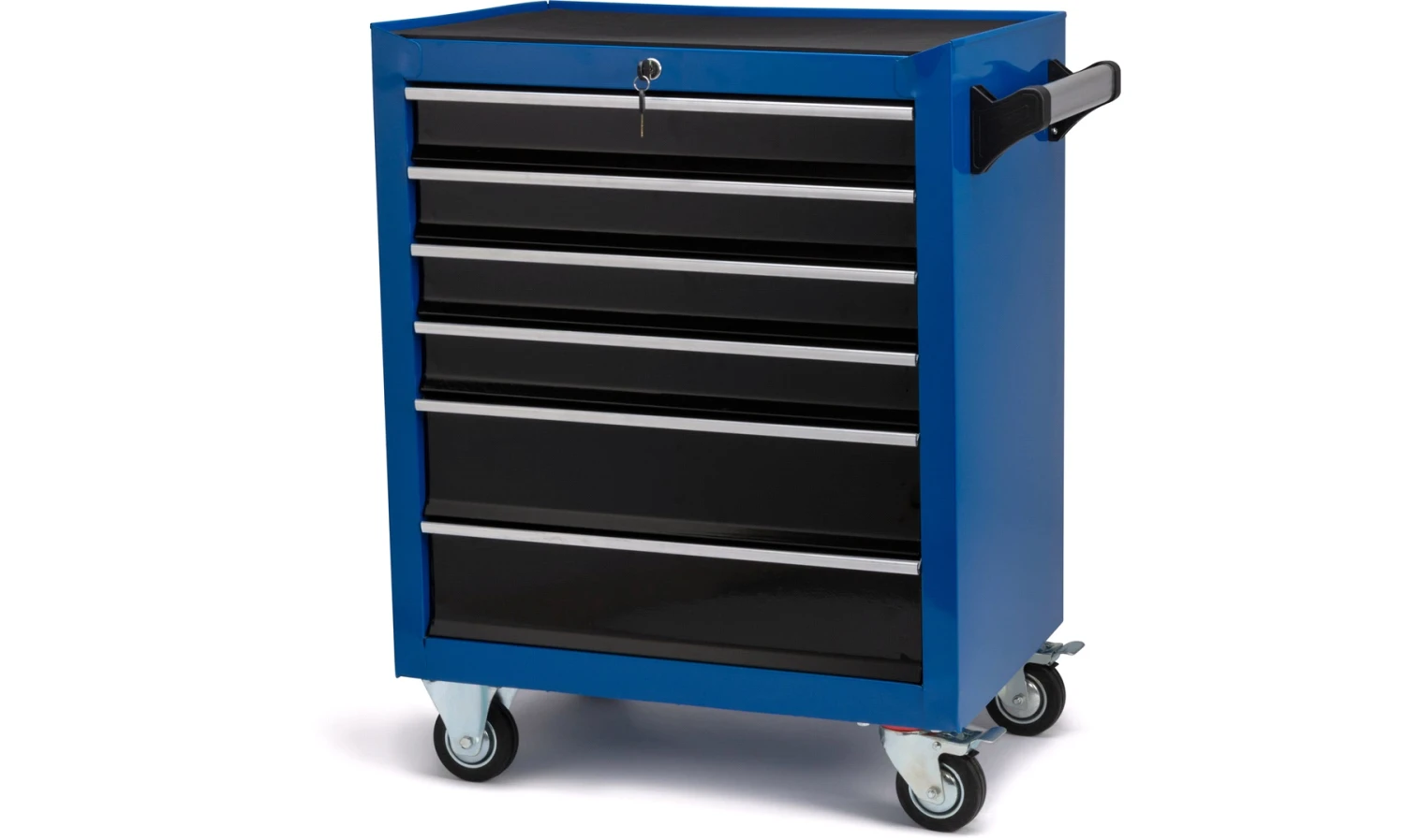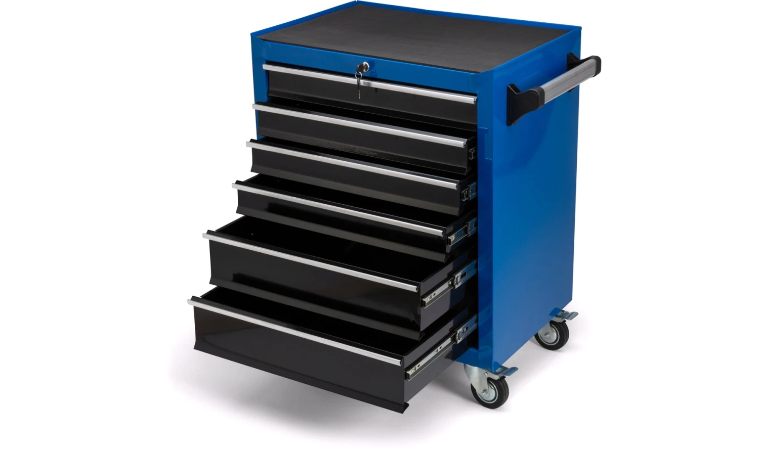 Solid verktøyvogn med skuffer og hjul.