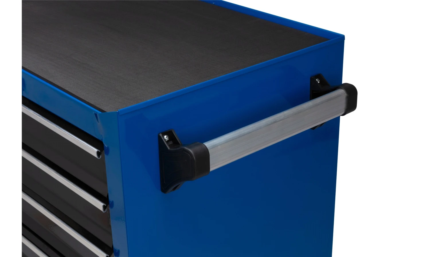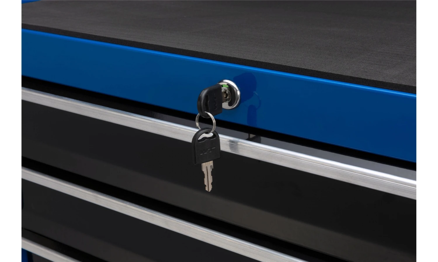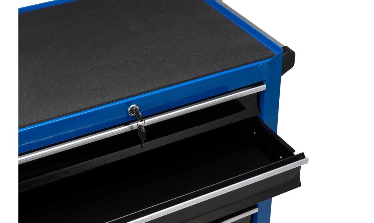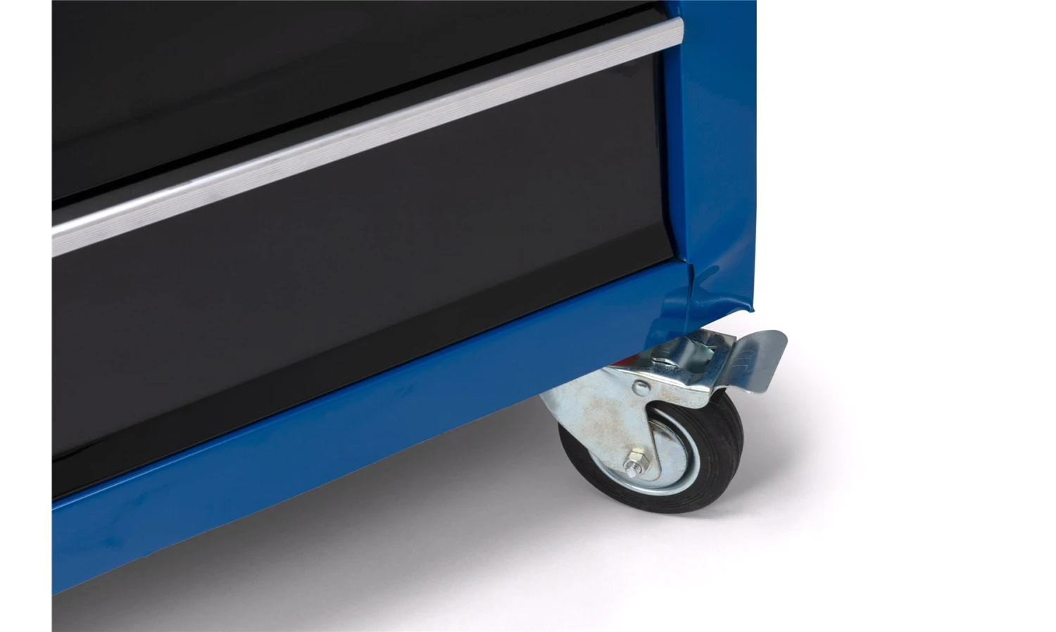 Solid verktøyvogn med skuffer og hjul.